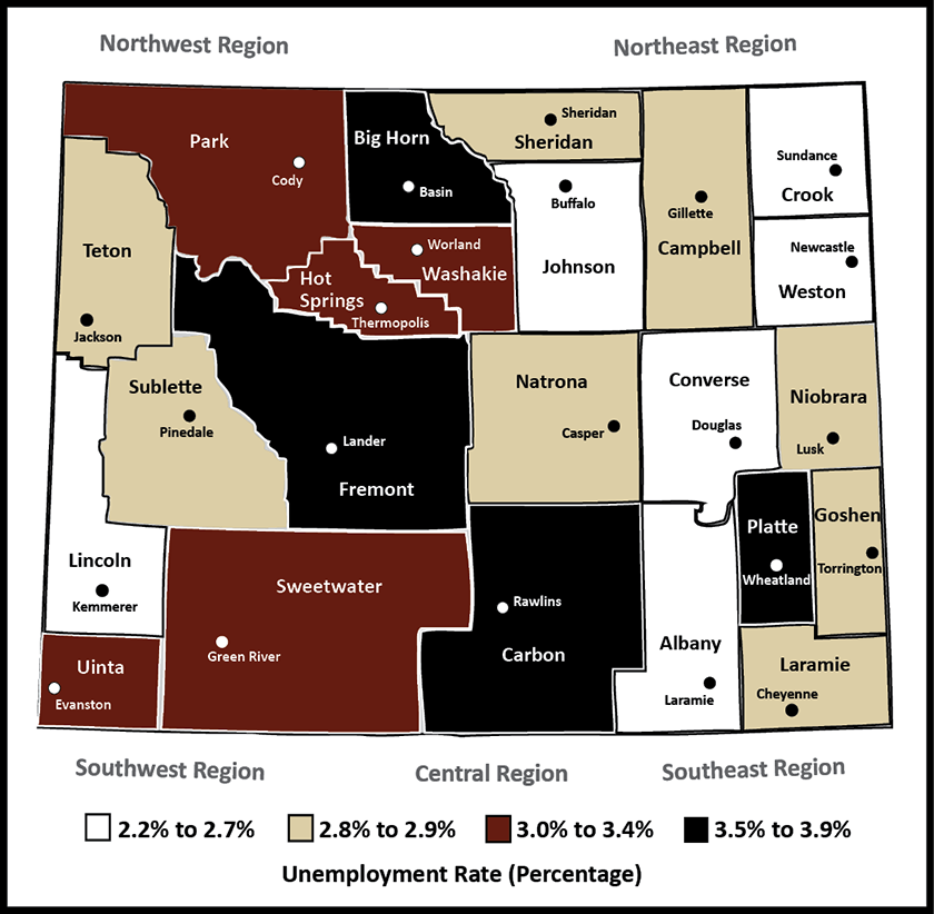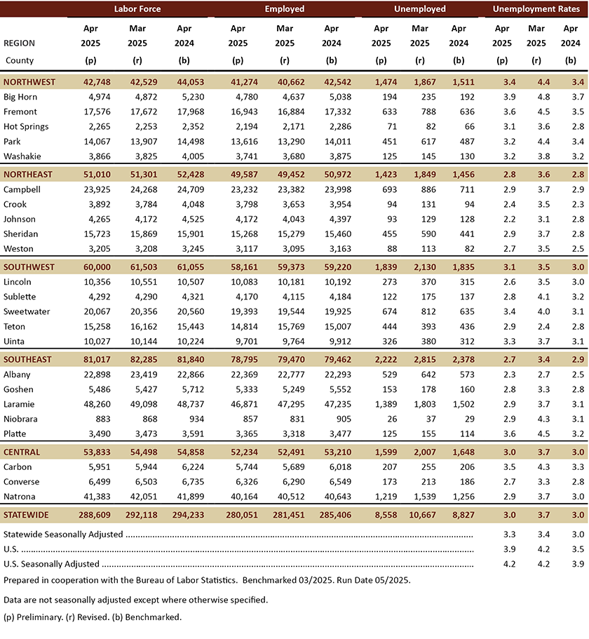 In April, the highest unemployment rates were found in Big Horn (3.9%), Fremont (3.6%), and Platte (3.6%) counties.