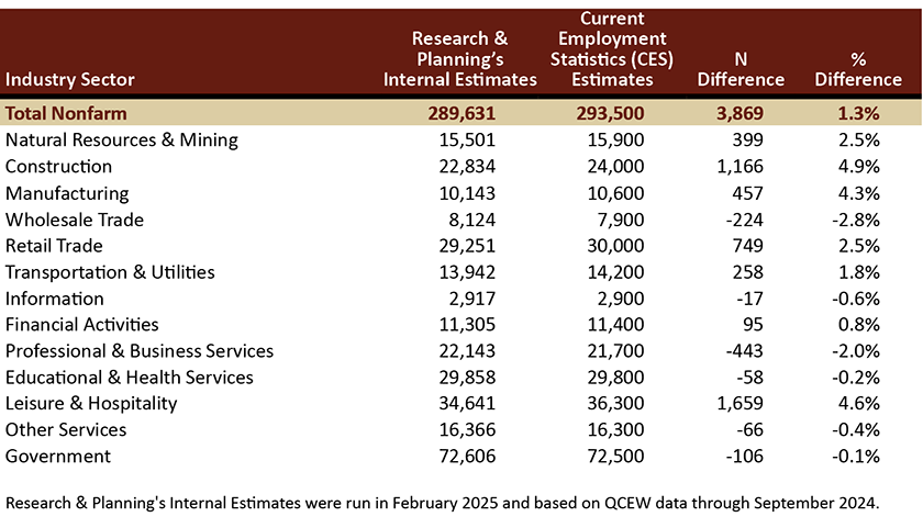 Current Employment Statistics (CES) Estimates and Research & Planning’s Internal Estimates, April 2025