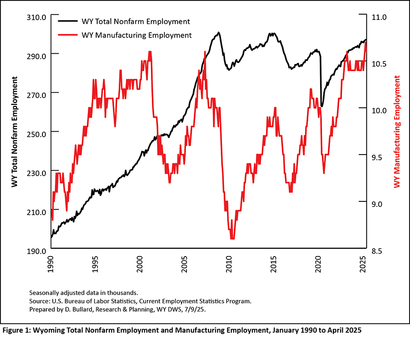 Figure 1 shows Wyoming total nonfarm employment and manufacturing employment from January 1990 to April 2025. Total employment steadily increased from early 1990 until October 2008. During that period, Wyoming added more than 100,000 jobs. Then, during the Great Recession, 19,300 jobs were lost, bringing employment to a low point of 281,500 in December 2009. Total employment then trended upward until hitting a peak of 300,300 in January 2015. From January 2015 to December 2016, employment fell by 18,300 jobs as large layoffs were seen in coal mining and oil & gas industries. During the Covid-19 pandemic in 2020, employment fell sharply, and then rebounded.