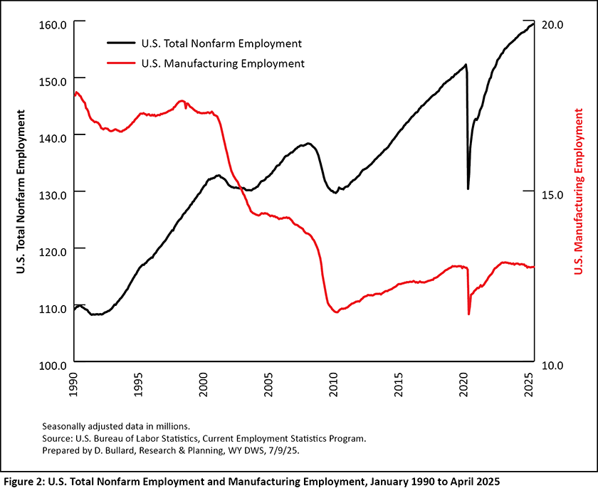 From 1990 to 2024, the share of U.S. jobs in manufacturing has fallen from 16.3% to 8.0%, while in Wyoming it has fallen from 4.5% to 3.6%.