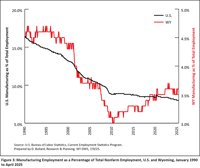Figure 3 compares Wyoming to the U.S. in the percentage of employment in the manufacturing sector. The black line for the U.S. almost always trends down, which suggests that even when manufacturing employment rose (as can be seen in Figure 2 from 2010 to 2019), it grew slower than total nonfarm employment. On the other hand, in Wyoming, manufacturing rebounded slightly from 3.0% in June 2010 to 3.6% in April 2025.