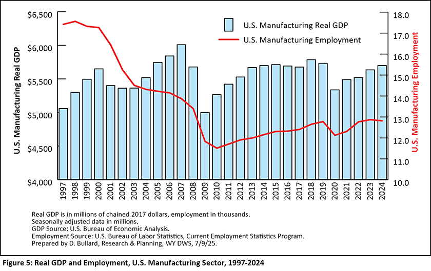 Real output in the U.S. manufacturing sector also increased from 1997 to present (see Figure 5). However, the gain was not as large as in Wyoming, as U.S. manufacturing output rose from $5.1 trillion in 1997 to $5.7 trillion in 2024, an increase of 12.7%. Because of increasing productivity, total output increased while employment fell. It seems particularly noteworthy that output increased each year from 2004 to 2007, even while employment fell.