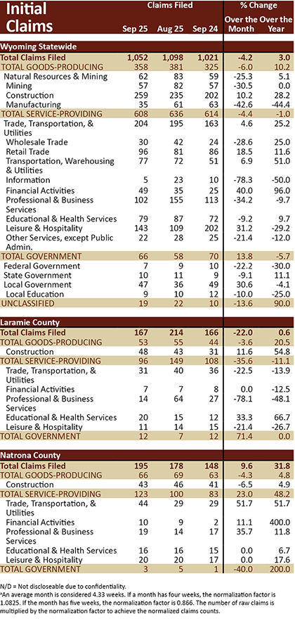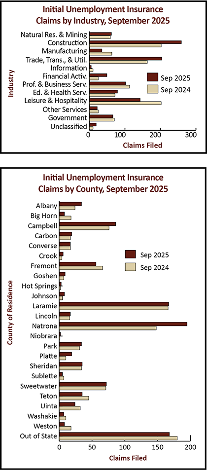 Four industries accounted for approximately two-thirds of all initial claims: construction; trade, transportation, & utilities; leisure & hospitality; and professional & business services. Note: the full Unemployment Insurance claims report for September 2025 is available by clicking here.