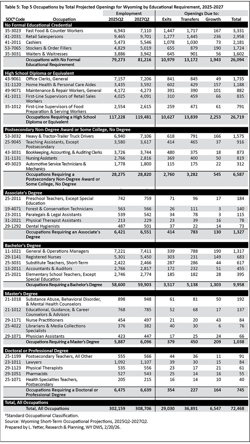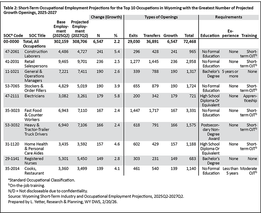 Yetter, L. (2025, March). Wyoming Short-Term Industry and Occupational Employment Projections, 2024-2026. Research & Planning, WY DWS. Retrieved March 18, 2026, from https://doe.state.wy.us/lmi/projections/2025/WY_ST_Projections_2024-2026.htm