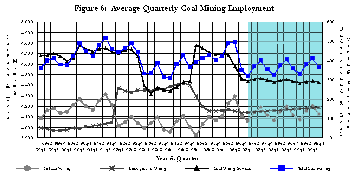 Surface mining employment shows many more seasonal fluctuations than the other two industry groups (see Figure 6), but the fluctuations are small; only six percent of the total is due to seasonal workers (around 200 employees). Around the second quarter of each year when the weather starts getting warmer, employment begins to increase. Employment typically reaches the highest level of the year in the third quarter of the year and then starts to go down, arriving at its lowest level in the first quarter. Underground mining employment did not show any seasonal changes. The employment in coal mining services has a similar seasonality to surface mining employment, but for the past eight quarters, it has shown an unseasonal continued decrease for some reason. The shaded area of Figure 6 represents the projected employment levels for the next 12 quarters. Total coal mining employment should remain about 4,700 in the third quarter each year and about 4,500 in the first quarter.