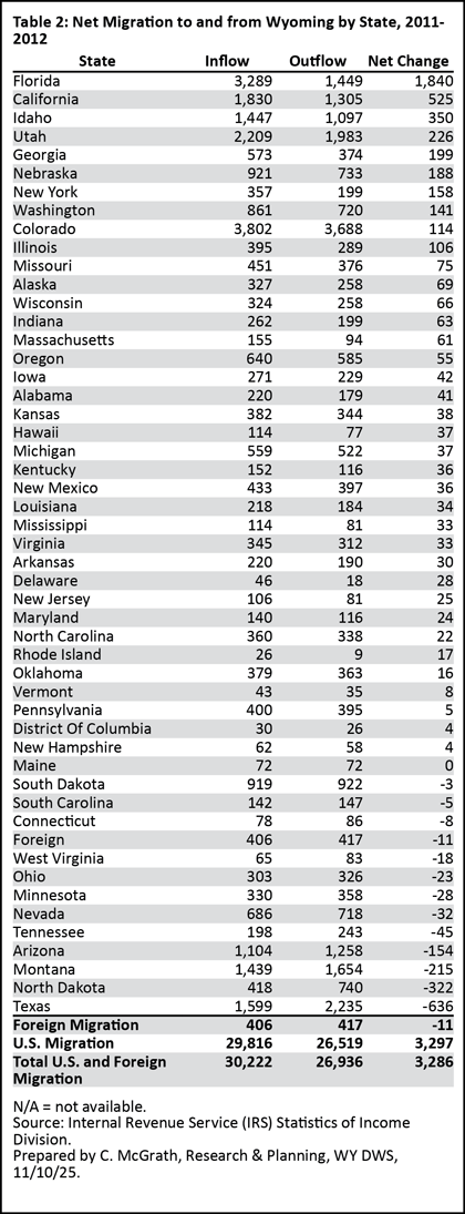 In terms of net out-migration from 2021-2022, the largest number of people left Wyoming for Texas (369), Florida (196), Arizona (176), South Dakota (169), and Tennessee (164). From 2011-2012, Texas also was the top destination for net out-migration (636), followed by North Dakota (322), Montana (215), and Arizona (154). Out-migration to Texas may be an indication of fewer jobs available in Wyoming, but more similar types of jobs available in Texas.
