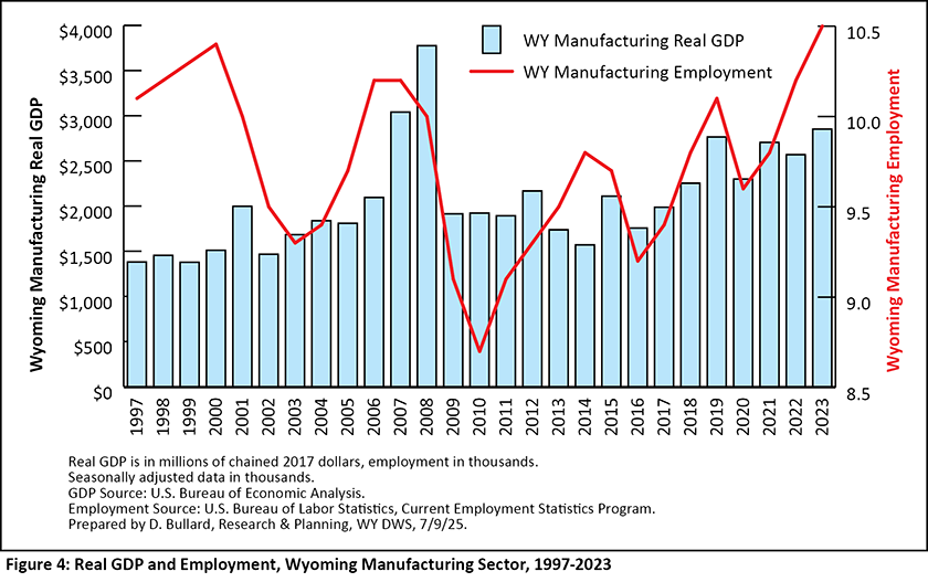 Figure 4 shows real gross domestic product (GDP) and employment for Wyoming’s manufacturing sector. Real GDP represents the total output of the manufacturing sector, expressed in real 2017 (inflation adjusted) dollars. Manufacturing firms in Wyoming produced more than twice as much output in 2023 ($2.9 billion) as they did in 1997 ($1.4 billion). Wyoming manufacturers doubled their output, while only employing 4.0% more workers.
