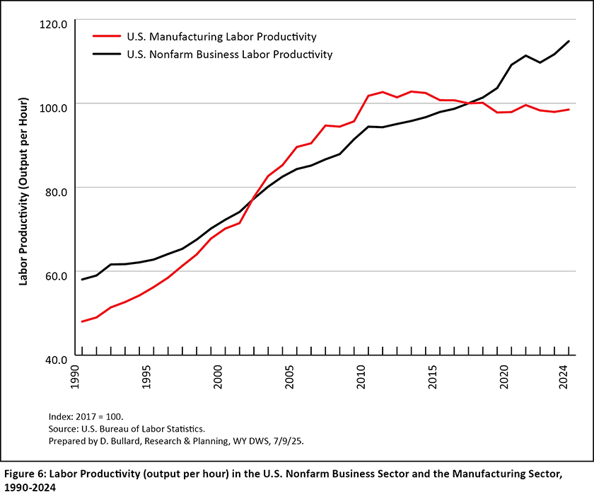 In summary, rising productivity has been an important force in the U.S. manufacturing sector. While U.S. manufacturing employment fell dramatically from 1990 to 2024, output rose significantly. In Wyoming, manufacturing employment rose while output more than doubled.