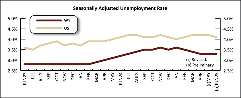 The Research & Planning section of the Wyoming Department of Workforce Services reported that the state’s seasonally adjusted1 unemployment rate held steady from May to June at 3.3%. Wyoming’s unemployment rate was just barely higher than its June 2024 level of 3.2%, but much lower than the current U.S. unemployment rate of 4.1%.