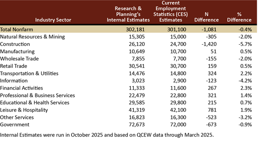 Current Employment Statistics (CES) Estimates and Research & Planning’s Internal Estimates, September 2025