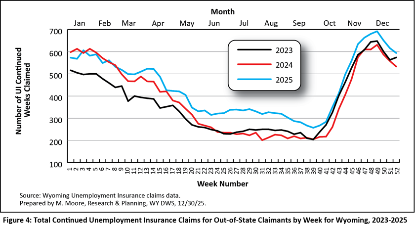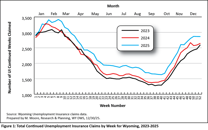 Weekly UI claims in Wyoming have followed a very consistent pattern for many years, and understanding these patterns can be beneficial for many of Wyoming’s stakeholders, including policymakers, jobseekers, and employers. Outside of periods of economic downturn, continued claims tend to be at their lowest during the warm summer months, increase in the fall, and peak in January and February. During each year from 2023 to 2025, the number of UI continued weeks claimed peaked from weeks four through eight in late January through February. Likewise, continued claims were at their lowest each year during weeks 37 through 40 during September.