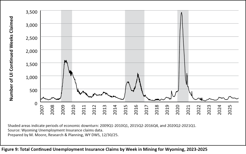During most years, Wyoming has relatively few UI claims from its mining sector. In 2024, for example, mining accounted for just 6.3% of all UI benefit recipients (Halama, 2025). However, as previously mentioned, all three of Wyoming’s economic downturns were preceded by declining energy prices. All three downturns included substantial job losses in Wyoming’s mining sector, which resulted in increases in continued UI claims during each downturn (see Figure 9).