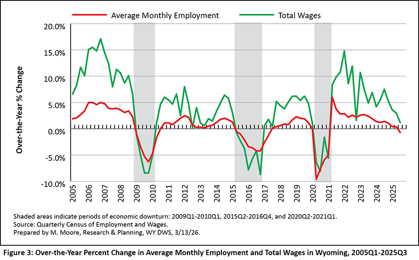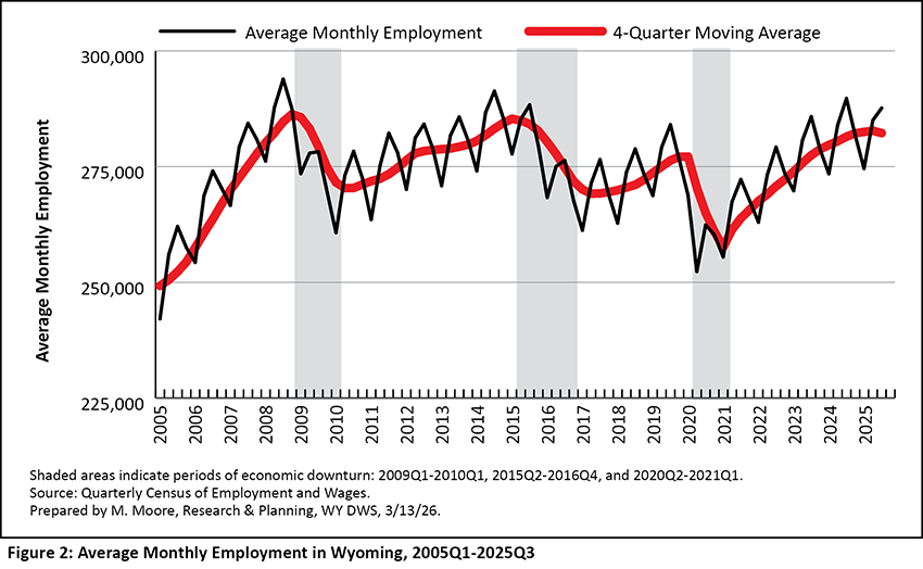Moore, M. (2026, March). 2025Q2 quarterly update: Minimal Job Growth Continues, Led by Construction. Wyoming Labor Force Trends, 63(3). Research & Planning, WY DWS. Retrieved March 18, 2026, from https://doe.state.wy.us/LMI/trends/0326/a2.htm