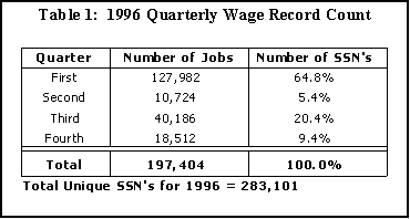 After the wage records are collected from the individual employers each quarter, all of the different employers are combined together to produce one statistical file. The total number of records can vary depending on the quarter of the year. For instance, in 1996, the number of records (the total number of jobs worked) ranged from a low (222,016) in first quarter to a high (268,522) in third quarter (see Table 1). The records are then grouped together by the SSN with each employer and the corresponding wages listed in descending order. This means that in third quarter there were 268,522 jobs worked by 229,814 people.