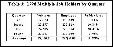 A more accurate count of multiple job holders for the year can be derived by determining the number of those people who are classified as multiple job holders and are working two jobs in a given quarter, then dividing that number by the total number of people working in that quarter. This will give the percentage of multiple job holders for each quarter. These figures are listed in Table 3. The percentage of multiple job holders varies each quarter with a high of 10.5 percent in third quarter to a low of 8.8 percent in first quarter. Then to obtain the percentage for the year, divide the average number of multiple job holders in each quarter by the average number of all workers each quarter. When this is done, the percentage of multiple job holders is reduced to 9.9 percent for 1996, which corresponds to the 9.5 percent found in the household survey.