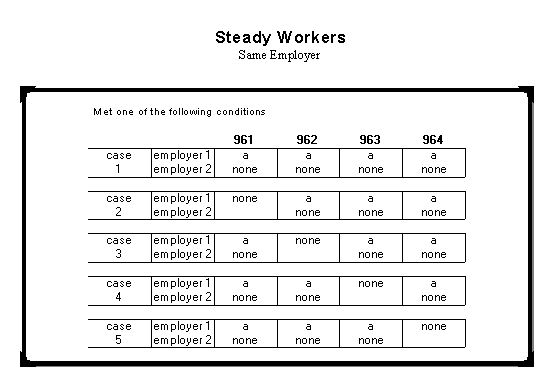 The article in Part A of this Appendix explains that the time frame in which an individual worked a particular job in the quarter is unknown. The following criteria and the cases that fit into that criteria were developed in an attempt to classify individuals into categories according to their degree of attachment to an employer and the labor market. The criteria and cases for three of the six categories are listed in the tables below.