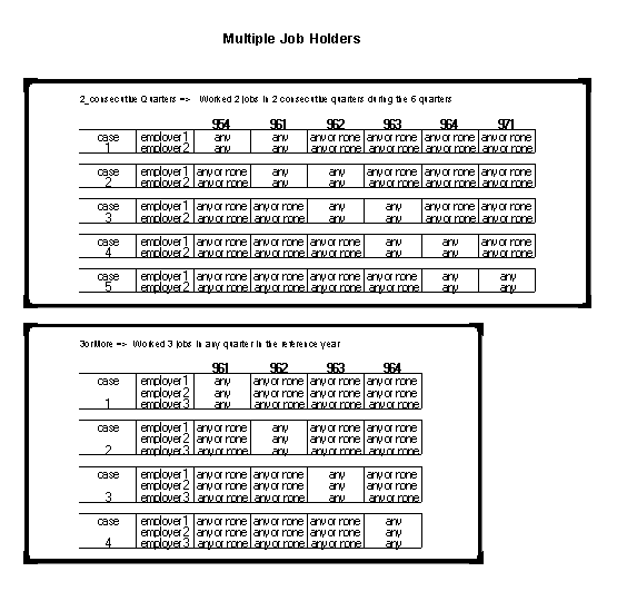 There are six different groups or categories in the classification system. The organizing concepts are the degree of attachment to an employer and the labor market. The categories are: steady workers/same employer (those working at least three quarters for the same employer), steady workers/different employer (those working at least three quarters but not for the same employer), multiple job holders, job changers, two-quarter workers and one-quarter workers. In order to make the occurrence of a record mutually exclusive, certain requirements were established and inclusion in one group was considered in sequence before another. Since this project originated in order to determine the number of multiple job holders, priority was given to this category first. If a record met one of the conditions for a multiple job holder, then it was a multiple job holder first and would not be considered for any of the other categories. The next consideration was for the category of job changer, then a steady worker/same employer, then a steady worker/different employer. If a record did not fall into one of the above categories, then it would be either a one- or two-quarter worker. When necessary, the fourth quarter of 1995 and/or the first quarter of 1997 data were included to make a determination of the classification.