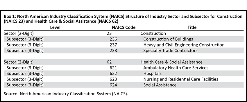 Industries are classified according to the North American Industry Classification System, (NAICS; see Box 1). The industry projections are developed at the three-digit NAICS subsector level and then summed to the two-digit major industries shown in Table 1. The full industry projections table with three-digit NAICS subsectors can be found in Table 6.