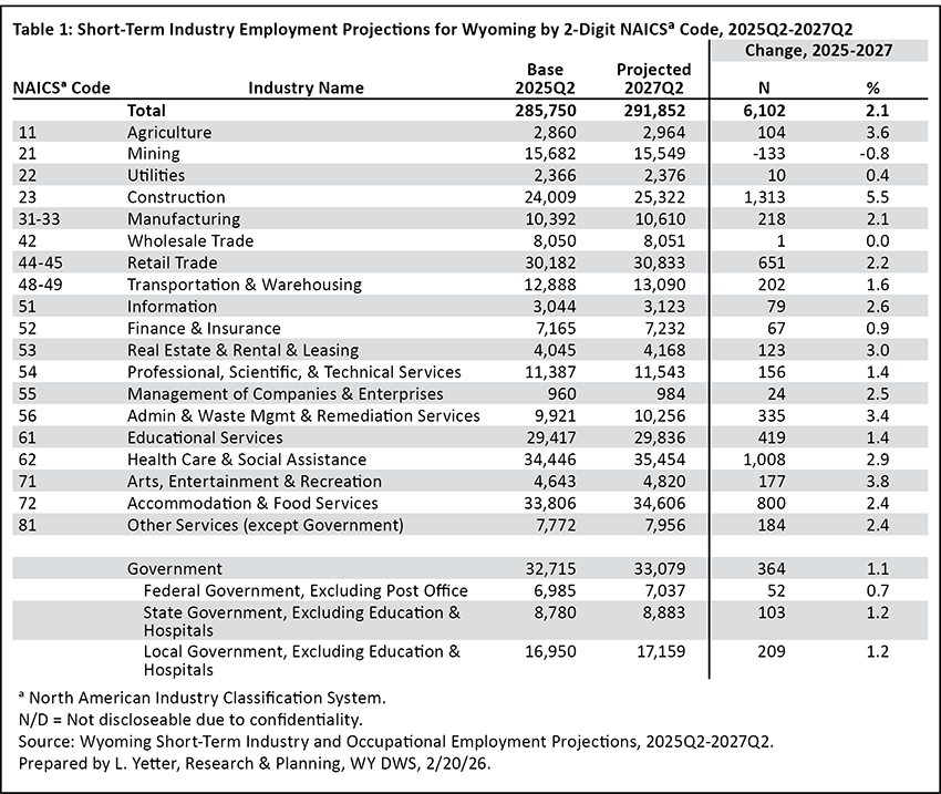 Wyoming is projected to gain more than 6,000 new jobs from second quarter 2025 (2025Q2) to second quarter 2027 (2027Q2), according to the newest short-term industry and occupational projections from the Research & Planning (R&P) section of the Wyoming Department of Workforce Services. This is a 2.1% increase in the number of jobs in Wyoming.