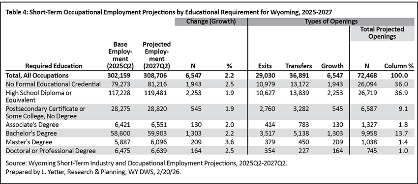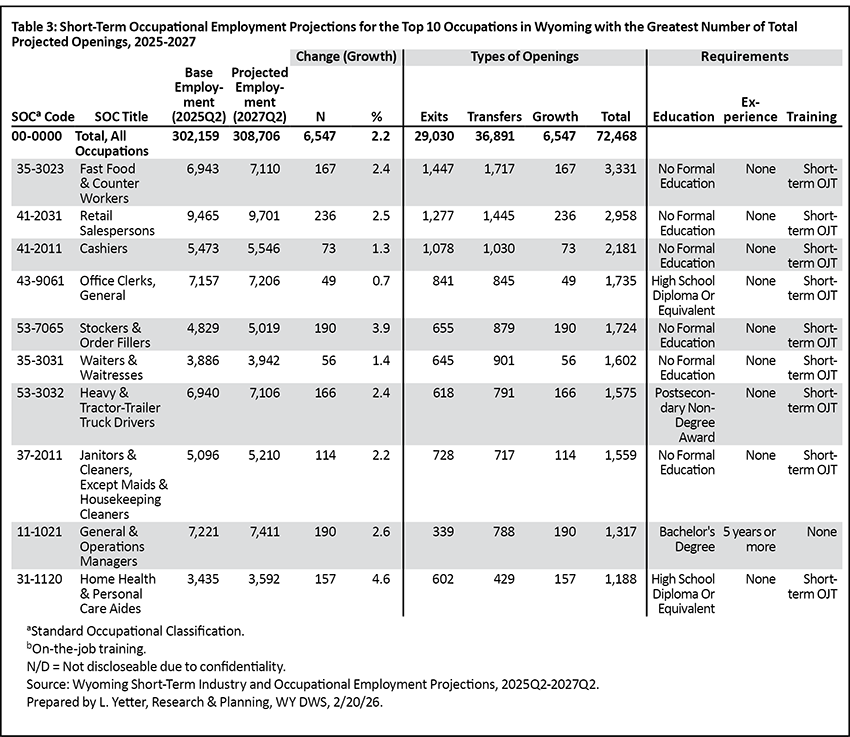 Yetter, L. (2025, March). Wyoming Short-Term Industry and Occupational Employment Projections, 2024-2026. Research & Planning, WY DWS. Retrieved March 18, 2026, from https://doe.state.wy.us/lmi/projections/2025/WY_ST_Projections_2024-2026.htm