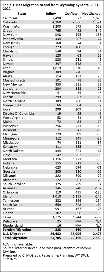 The largest net in-migration of people into Wyoming (inflow minus outflow) from 2021-2022 came from California (1,526), Colorado (1,394), Washington (628), Oregon (342), New York (153), and Pennsylvania (127). The substantial amount from Colorado could be attributed to post-COVID migration; as noted by Haderlie (2023), “data from the early pandemic years shows that more people migrated into Wyoming than left the state, and most came to the Equality State from Colorado.”