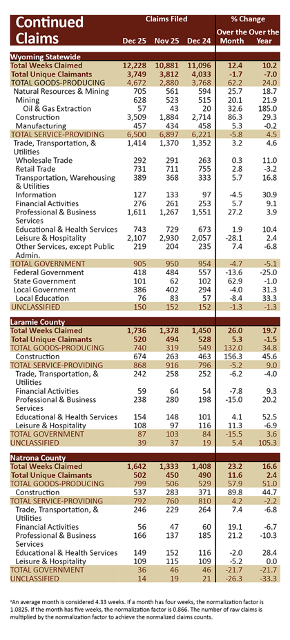 The total number of continued weeks claimed increased from 11,096 in December 2024 to 12,228 in December 2025 (1,132, or 10.2%). Note: the full Unemployment Insurance claims report for December 2025 is available by clicking here.