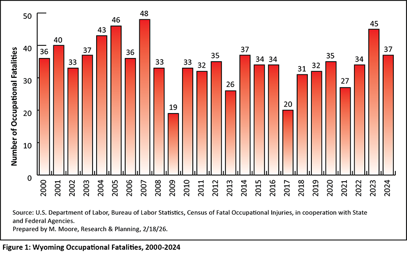 The number of occupational fatalities in Wyoming decreased from 45 in 2023 to 37 in 2024 (a decrease of eight deaths, or 17.8%; see Figure 1).