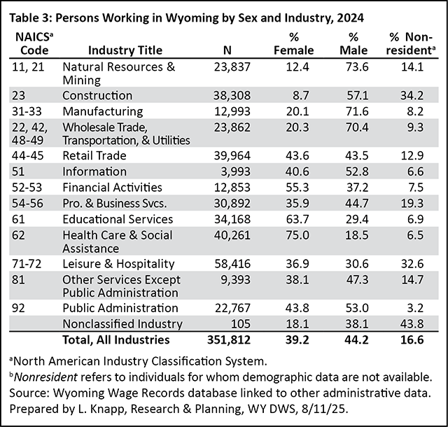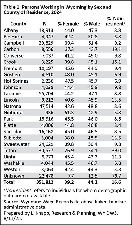 Overall, as shown in Table 1, 44.2% of Wyoming’s workforce in 2024 was male, 39.2% was female, and 16.6% were nonresidents. The term nonresidents refers to individuals for whom demographic data are not available. Nonresident workers frequently are individuals who come to Wyoming for seasonal or temporary work from another state or country. Some nonresident workers may move to Wyoming for long-term employment.