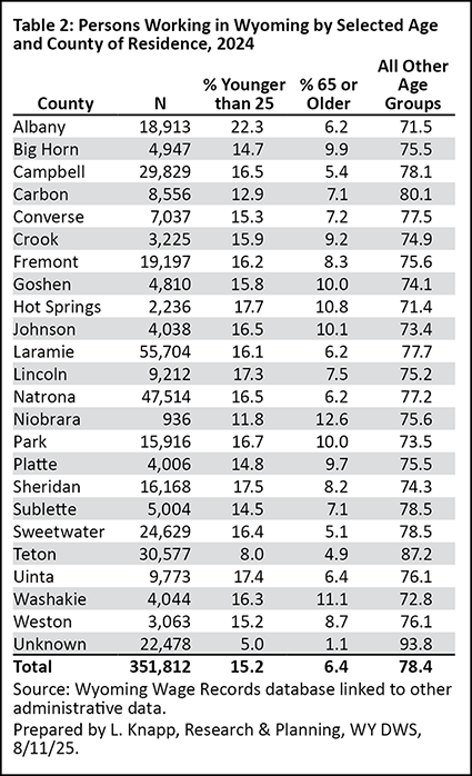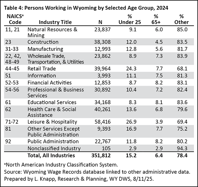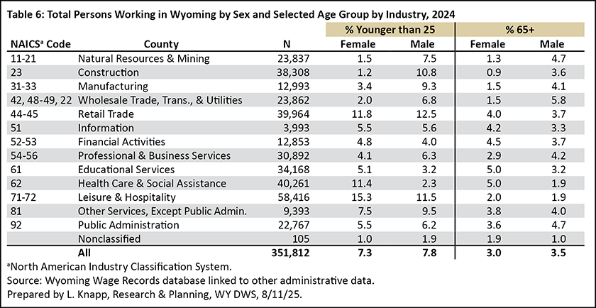 This article focuses specifically on the age and sex characteristics of people working in Wyoming in 2024. Chapter 6 in the 2025 Wyoming Workforce Annual Report looks at changes in the demographics over time in Wyoming’s workforce, and is available at https://doe.state.wy.us/LMI/annual-report/2025/2025_Annual_Report.pdf#page=38.