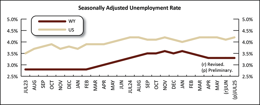 The Research & Planning section of the Wyoming Department of Workforce Services reported that the state’s seasonally adjusted1 unemployment rate held steady from June to July at 3.3%. Wyoming’s unemployment rate was unchanged from its July 2024 level and lower than the current U.S. rate of 4.2%.