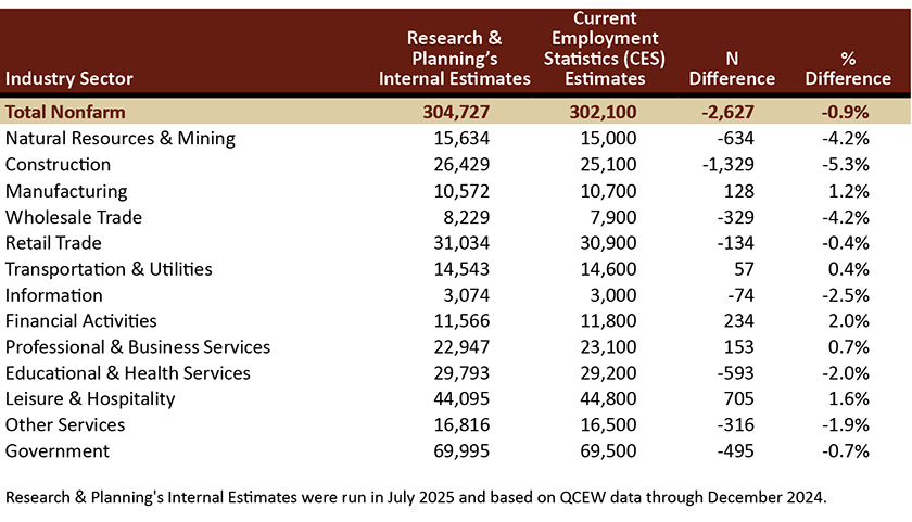 Current Employment Statistics (CES) Estimates and Research & Planning’s Internal Estimates, August 2025