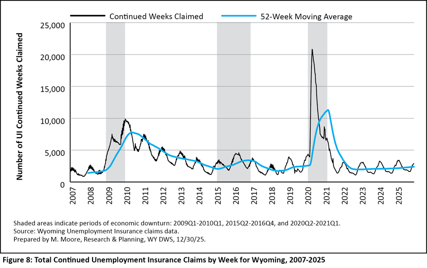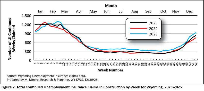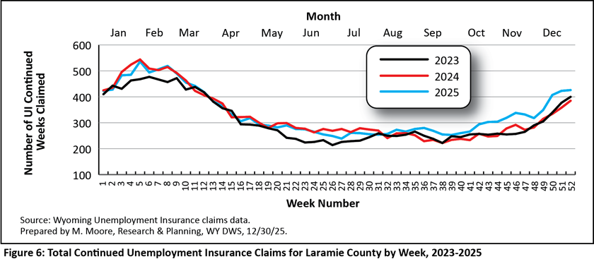 Weekly UI claims in Wyoming have followed a very consistent pattern for many years, and understanding these patterns can be beneficial for many of Wyoming’s stakeholders, including policymakers, jobseekers, and employers. Outside of periods of economic downturn, continued claims tend to be at their lowest during the warm summer months, increase in the fall, and peak in January and February. During each year from 2023 to 2025, the number of UI continued weeks claimed peaked from weeks four through eight in late January through February. Likewise, continued claims were at their lowest each year during weeks 37 through 40 during September.