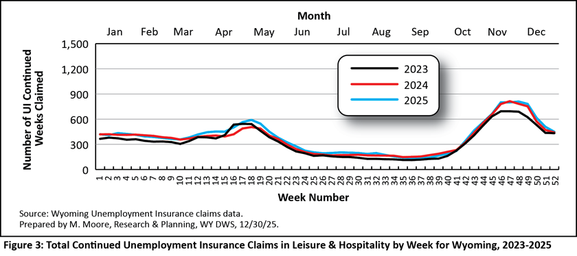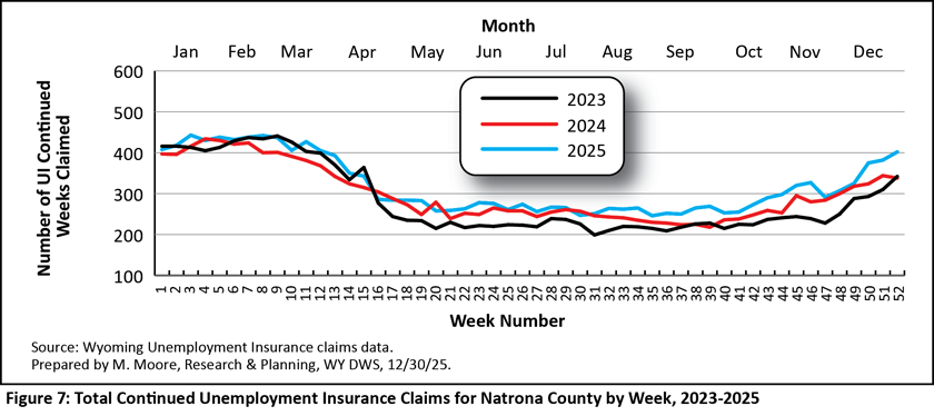 Continued claims for Laramie and Natrona counties follow the same general pattern as the statewide total presented in Figure 1: peaking during the first three months of the calendar year, decreasing during the summer months, and then increasing again in the fall. Laramie County (see Figure 6) likely follows this pattern due to the large presence of local and state government jobs, which add jobs during the warm summer months, just like construction and leisure & hospitality. While continued claims in Natrona County follow the same general trend, the ups and downs are less pronounced (see Figure 7). For example, in 2025, continued claims peaked at 443 in week three and were at their lowest at 246 in week 35. The less pronounced highs and lows could be indicative of fewer seasonal jobs in Natrona County compared to other counties.