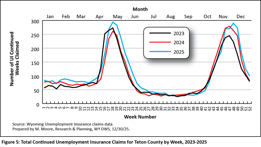 Teton County has very unique but very consistent patterns of employment and UI claims, due to the large number of leisure & hospitality jobs (see Figure 5). In 2024, leisure & hospitality made up more than one in three jobs (36.8%) in Teton County (Research & Planning, 2025). As previously mentioned, continued UI claims in leisure & hospitality have two peaks because of the increase in jobs in summer and winter.