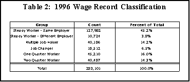 There are six different groups or categories in the classification system. The organizing concepts are the degree of attachment to an employer and the labor market. The categories are: steady workers/same employer (those working at least three quarters for the same employer), steady workers/different employer (those working at least three quarters but not for the same employer), multiple job holders, job changers, two-quarter workers and one-quarter workers. In order to make the occurrence of a record mutually exclusive, certain requirements were established and inclusion in one group was considered in sequence before another. Since this project originated in order to determine the number of multiple job holders, priority was given to this category first. If a record met one of the conditions for a multiple job holder, then it was a multiple job holder first and would not be considered for any of the other categories. The next consideration was for the category of job changer, then a steady worker/same employer, then a steady worker/different employer. If a record did not fall into one of the above categories, then it would be either a one- or two-quarter worker. When necessary, the fourth quarter of 1995 and/or the first quarter of 1997 data were included to make a determination of the classification.